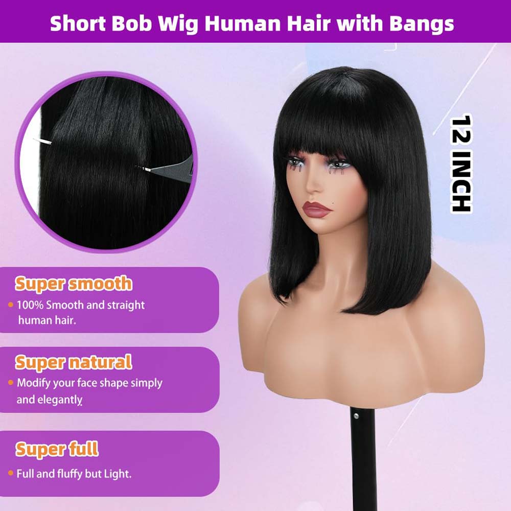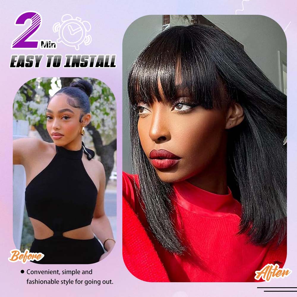 Hair Advantage:Machine Made Short Bob Wigs with Bangs,Comfortable and Breathable.No Tangles,No Shedding,No Chemical Synthetic Hair,No Smell,Can be Dyed and Permed as you like,Last for Long with Good Hair Care.Full and Thick,Cap with Adjustable Strap,Suitable for Majority Women,More Easy to Install.