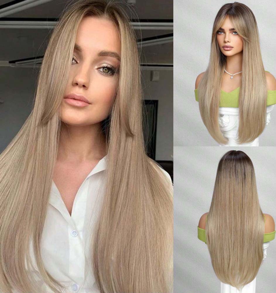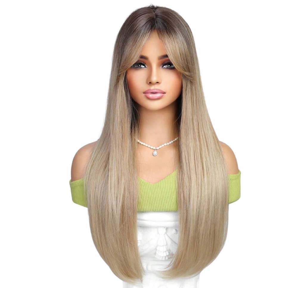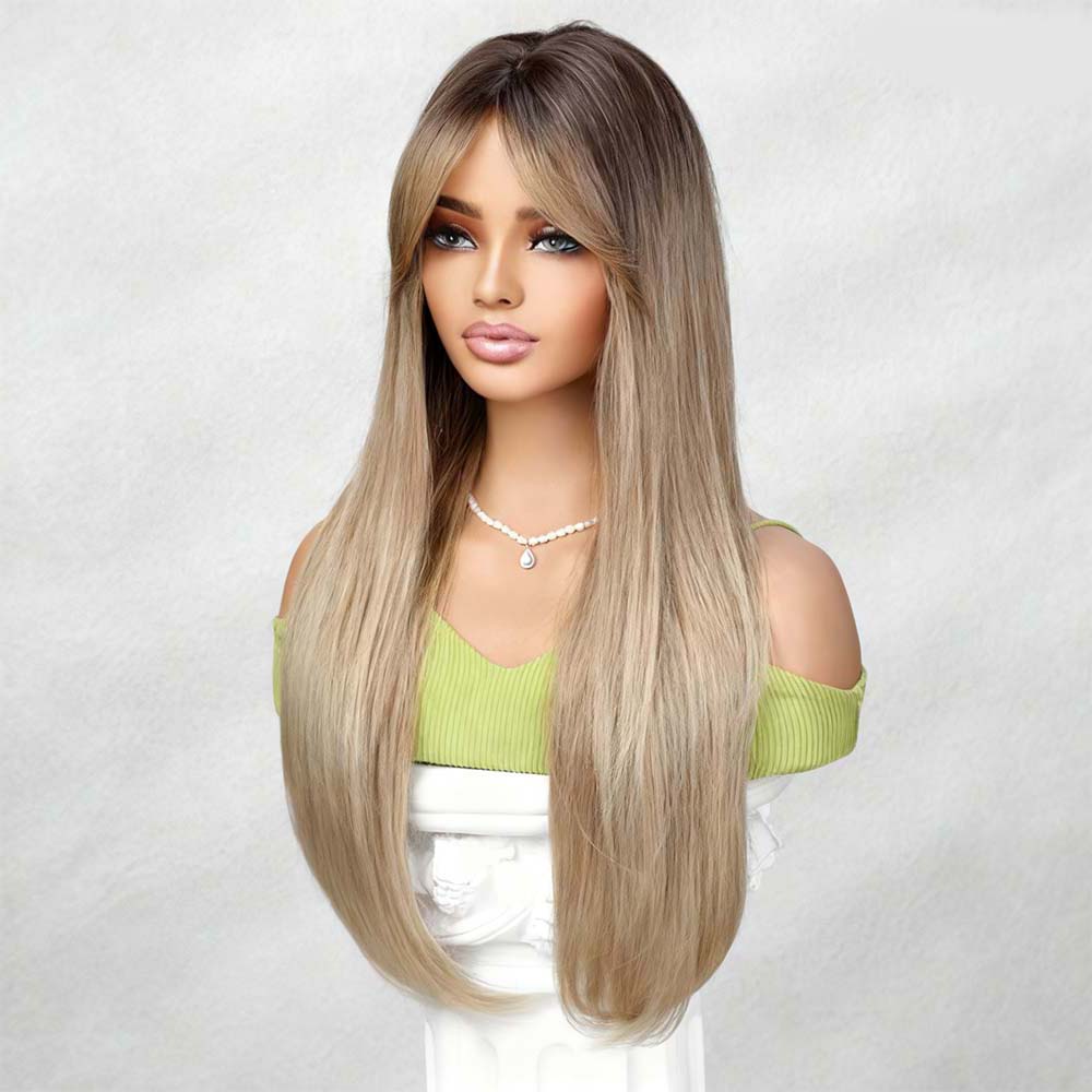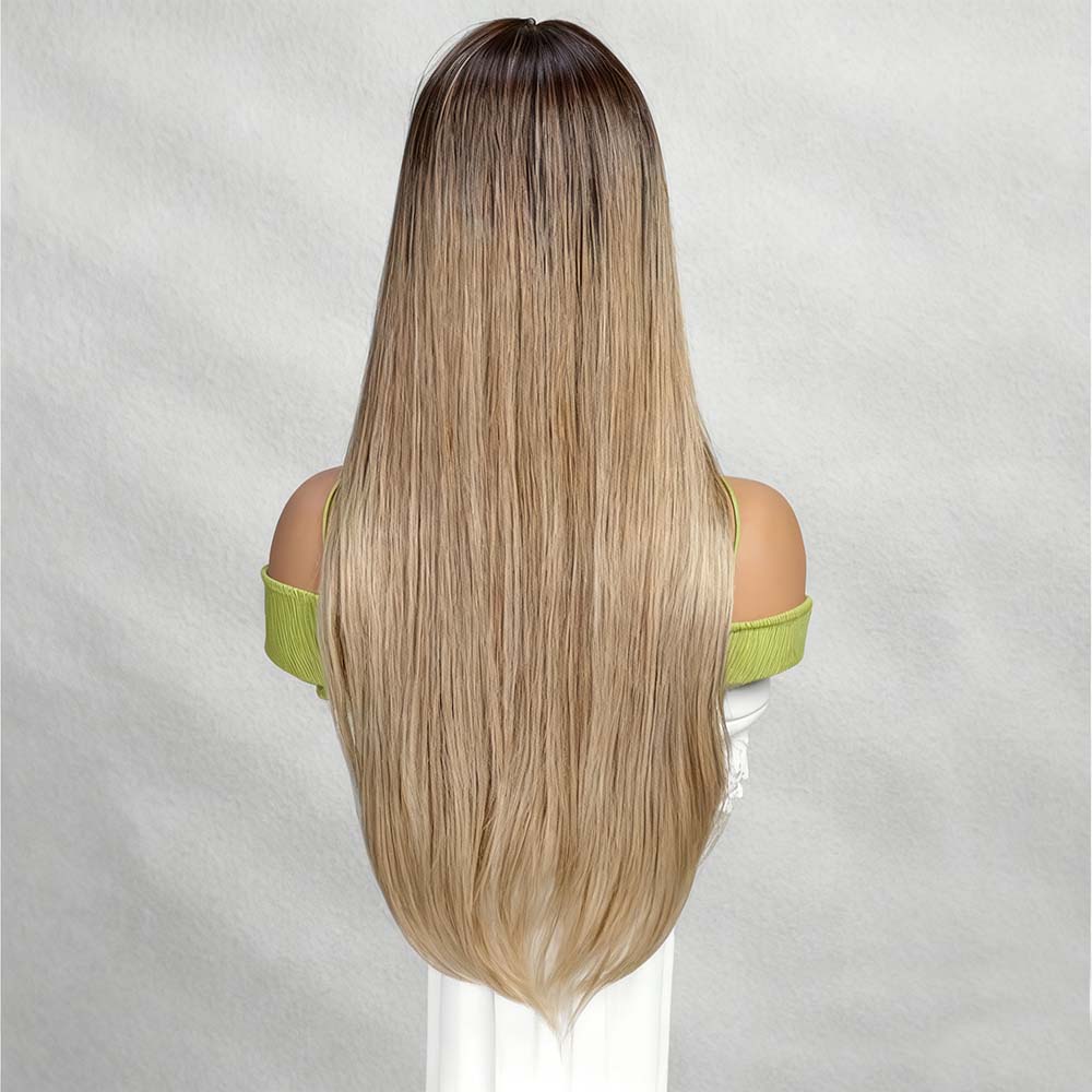Jessie's Wig Long Straight Brown Synthetic Hair With Blonde Roots Heat Resistant Synthetic Hair Wigs For Women 26 Inch
